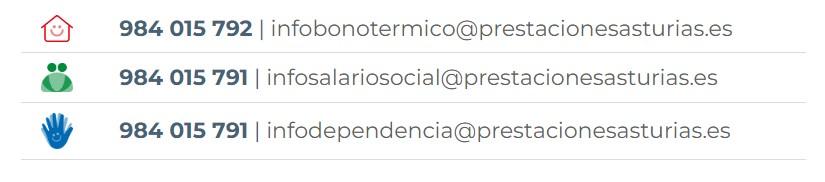 Para atender de manera eficiente las demandas de información se han puesto en marcha, además de la web https://prestacionesasturias.es/, perfiles en las redes sociales y líneas de teléfono y direcciones de correo electrónico específicas, que están incorporadas a la página. Son las siguientes: