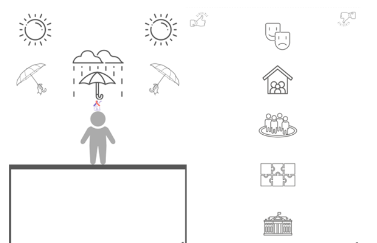 Las nubes representan las causas de las causas de los problemas, las condiciones que vivimos en nuestros tiempos y en nuestros territorios y que están provocando que niñas, niños y adolescentes (NNA) y sus familias vivan situaciones que amenazan su bienestar.