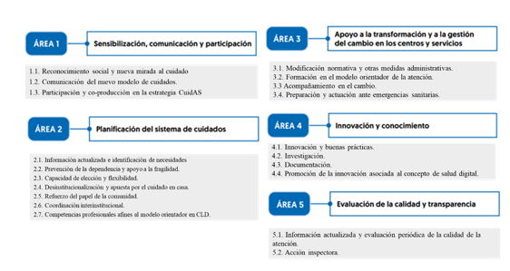 La estrategia CuidAs, recogiendo las propuestas derivadas de la fase diagnóstica y de la escucha a diversos actores, se articula en cinco áreas, veinte líneas de acción e incluye un total de 105 medidas. Se plantea como una ruta abierta a nuevas aportaciones de entidades, grupos y personas, para así ir construyendo y adaptando itinerarios progresivos en los distintos contextos y servicios que proporcionan cuidados/apoyos a personas adultas en situación de fragilidad y dependencia.