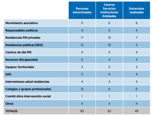 En la formulación de esta estrategia se partió de un análisis crítico del sistema actual de servicios sociales, tomando los datos de una encuesta sobre preferencias en cuidados a población entre 55 y 75 años (Blanco y Valbuena, 2021) así como la realización de entrevistas (individuales y grupales) en las que participaron un total de 83 informantes clave de 62 centros/entidades (Tabla 1.)