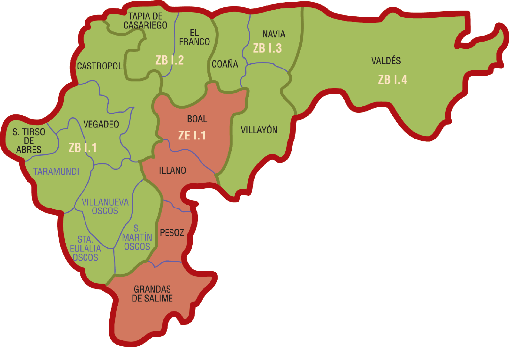 S. Tirso de Abres, Vegadeo, Taramundi, Castropol, Tapia de Casariego, Villanueva de Oscos, Sta. Eulalia de Oscos, S. Martín de Oscos, El Franco, Coaña, Navia, Villayón, Valdés, Boal, Illano, Pesoz, Grandas de Salime.